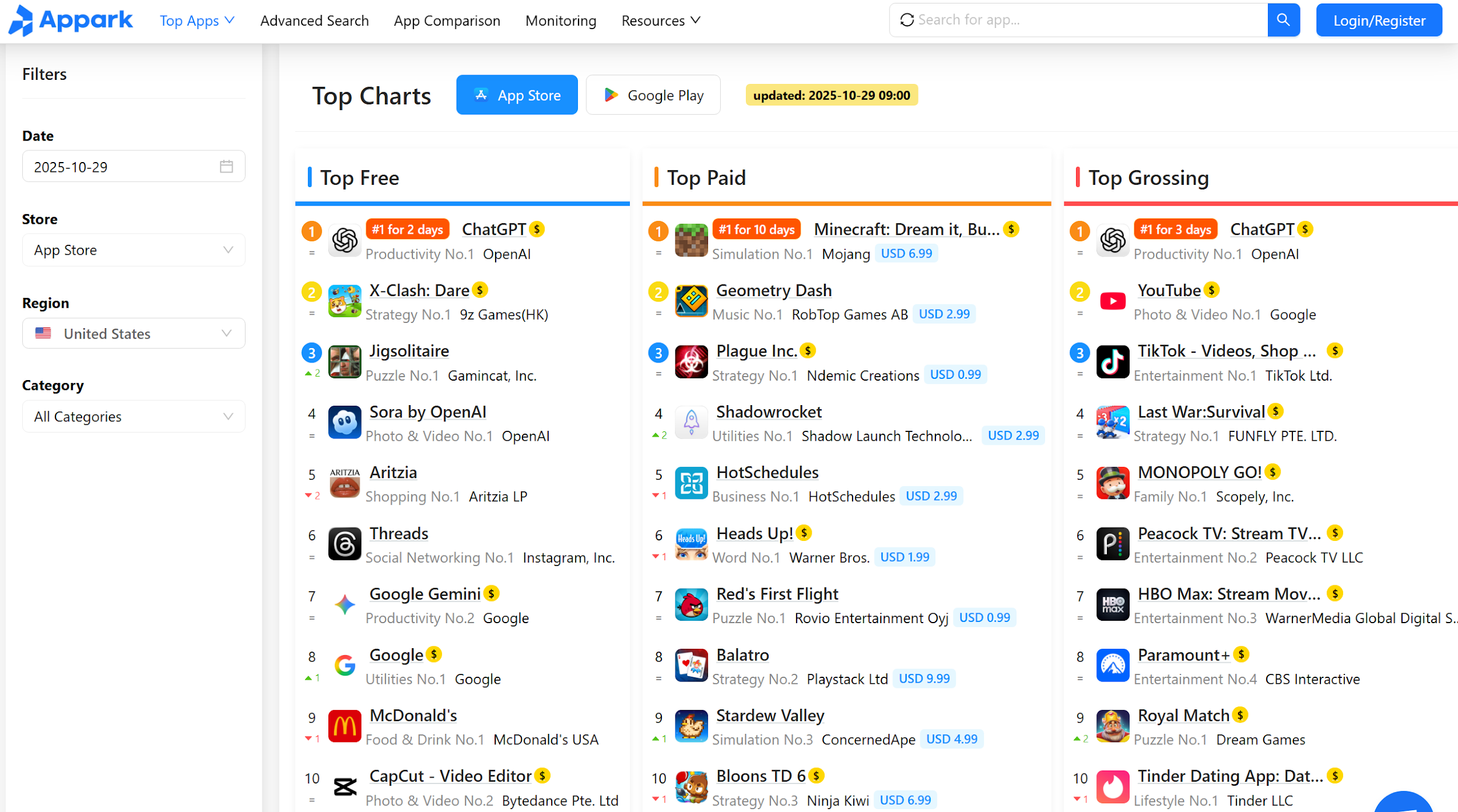 Appark enables users to access Top Charts which show the performance of all free and paid and grossing applications. Top Charts provide competitors with valuable information because they show which applications dominate particular market segments and geographic areas. The process of tracking these charts manually requires a considerable amount of time which leads to disjointed results.