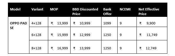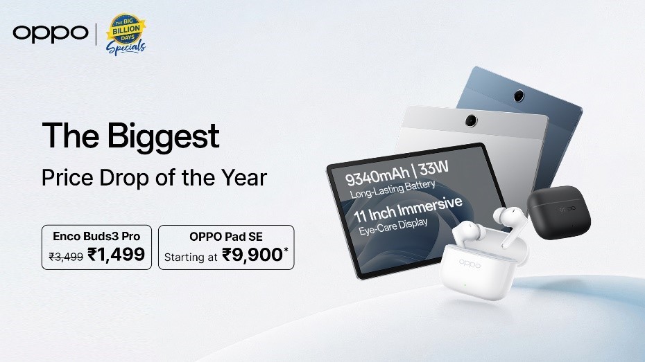 This Flipkart Big Billion Day Sale, OPPO brings you unbeatable deals on two of its most versatile devices–the OPPO Pad SE and the OPPO Enco Buds 3 Pro. The OPPO Pad SE, a sleek and powerful tablet with an 11-inch Eye-Care Display, massive 9,340mAh battery with 33W SUPERVOOCTM charging, quad speakers with Hi-Res certification, and AI-powered productivity tools including Google Gemini integration, is designed for seamless entertainment, learning, and work on the go–now available at an exciting starting price of just ₹9,900 (MRP ₹19,499). Complementing it is the OPPO Enco Buds 3 Pro, offering up to 54 hours of playback, TUV-certified battery health, 12.4mm dynamic drivers for deep immersive sound, 47ms ultra-low latency for gaming, and IP55-rated durability–all at a special festive price of ₹1,499 (MRP ₹3499). With additional bank offers across leading banks, this festive season is the perfect time to elevate your entertainment, productivity, and everyday experiences with OPPO.
