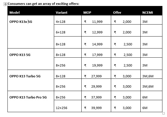 As part of the Flipkart Big Billion Day Sale, the OPPO K Series is now available at its most attractive prices yet. The OPPO K13x 5G will be offered at a special festive price of ₹9,499 on 22nd and 23rd September, and at ₹9,999 from 24th September onwards, making it the toughest 5G smartphone under ₹10K. The OPPO K13 5G is priced at ₹15,499, while the K13 Turbo Series is available starting at ₹24,999. To make upgrades even easier, the K13x 5G and K13 5G come with 3-month No Cost EMI options, while the K13 Turbo Series offers both 3-month and 6-month No Cost EMI plans respectively.