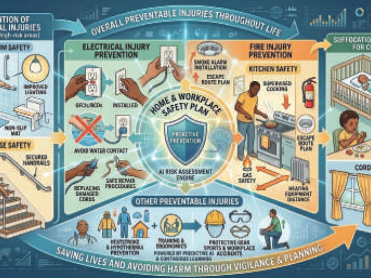 Hyperthermia (Heatstroke), frostbite, and hypothermia due to exposure to extreme weather, back injury by lifting heavy objects improperly, Musculoskeletal Disorders (MSDs) due to heavy lifting, awkward postures, and repetitive tasks, back & neck pain due to poor posture, or inadequate seating, Repetitive Strain Injuries (RSI) due to poor ergonomics, eye strain due to prolonged screen exposure, cuts & crush Injuries from machinery accidents and sharp tools, sprains and strains in ankles, knees, shoulders, and wrists in sports and gym, overuse injuries (e.g., tennis elbow), muscle tears following sudden exertion without warm-up, concussion injuries in contact sports, are all preventable with awareness, safety measures, protective equipment (Helmets, gloves, goggles, ear protection, respirators), stress management, proper training and ergonomics. Better safe than sorry. Prevention of injury is essential as injuries cause pain, stiffness, disability, and leave behind physical and mental scars.
