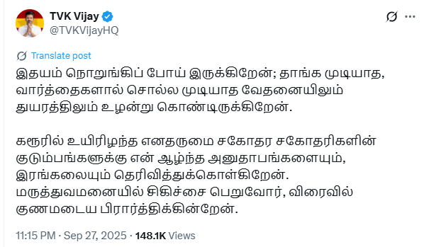 "My heart is shattered; I am writhing in unbearable, indescribable pain and sorrow that words cannot express. I extend my deepest condolences and sympathies to the families of my dear brothers and sisters who lost their lives in Karur. I pray for the swift recovery of those receiving treatment in the hospital," Vijay posted.