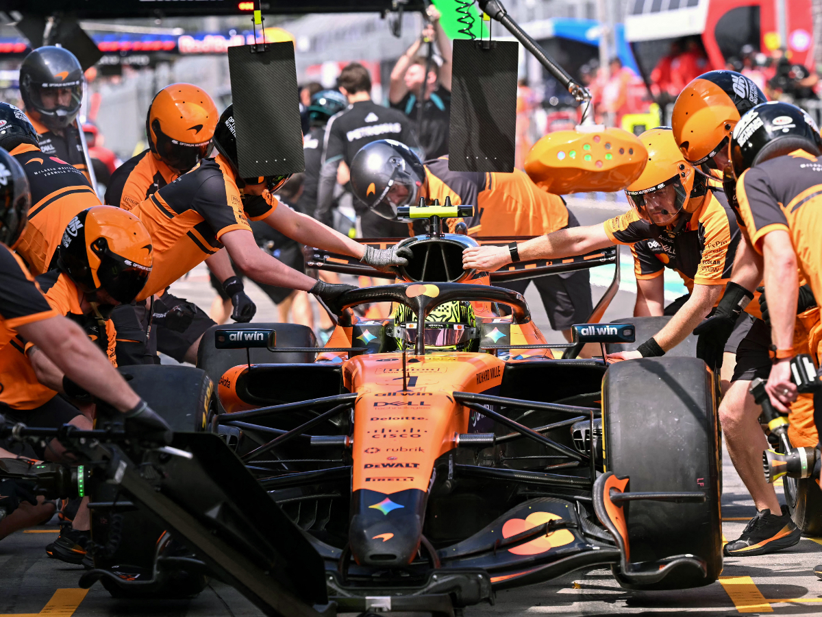 It caused a crack in Norris’s front wing, forcing him back to the garage where mechanics taped up the damage.