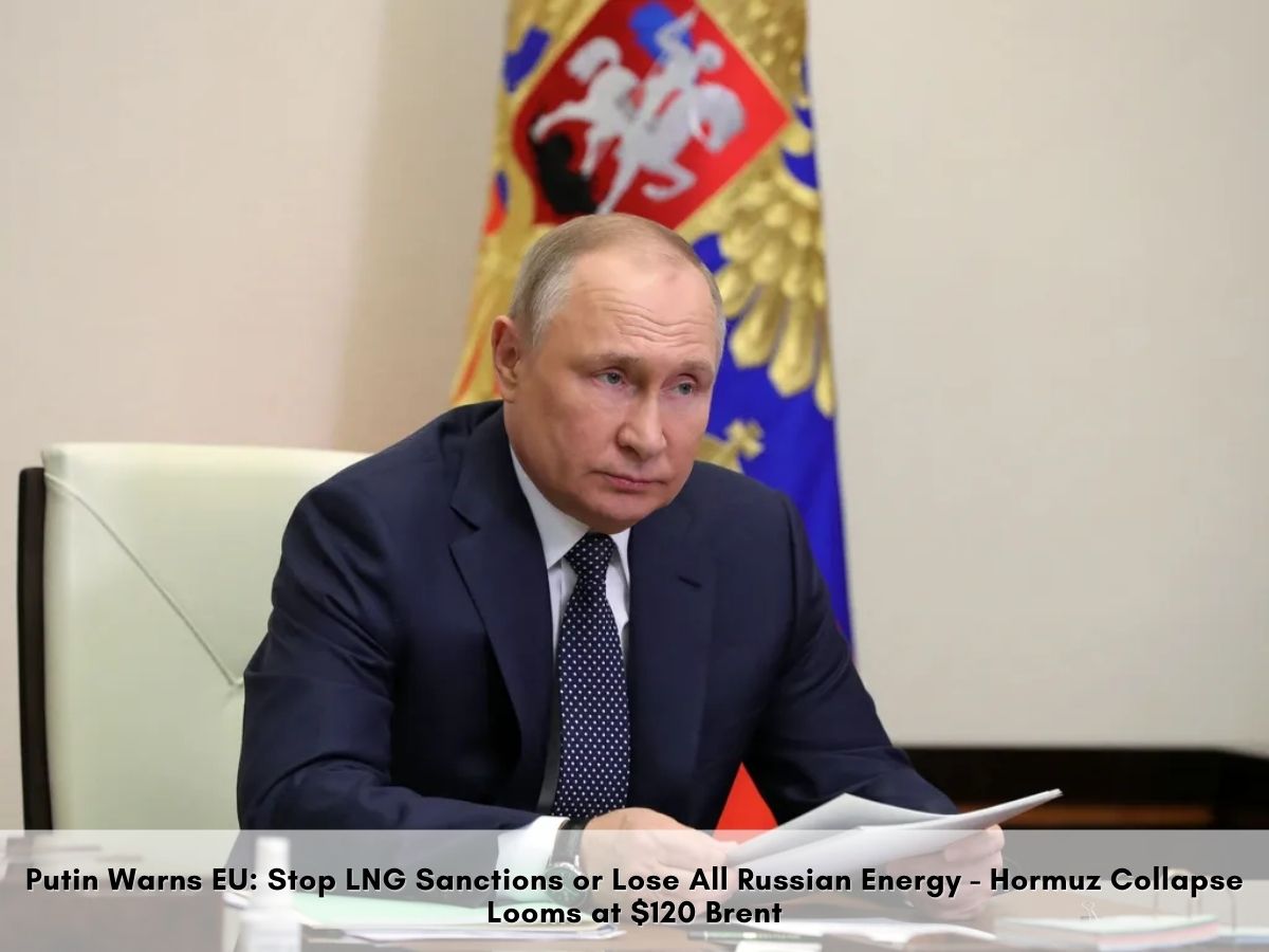 President Vladimir Putin warned Monday that Russia stands ready to completely halt energy exports to Europe if the EU imposes fresh LNG and energy sanctions, vowing not to “wait for the door to be shut in our face.” The threat lands as Brent crude surges to $120 per barrel from Iran war disruptions, with Putin predicting Strait of Hormuz flows—20% of global oil—could vanish next month, devastating markets already reeling from Gulf strikes.