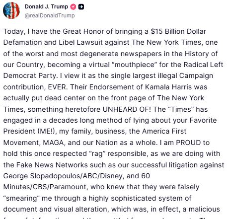 In a post on his social media platform, Truth Social, Trump described the lawsuit as the largest illegal campaign contribution ever, alleging that the Times had effectively become a "mouthpiece" for the Democratic Party. He also criticised the newspaper's front-page endorsement of Vice President Kamala Harris, calling it "something heretofore unheard of."
